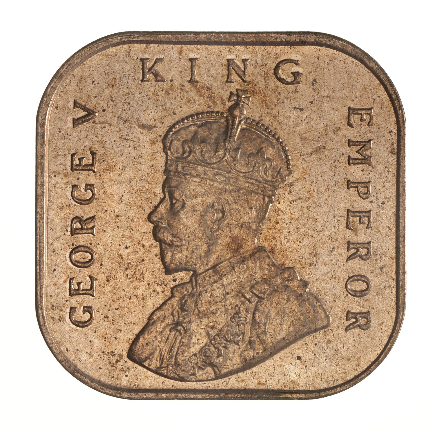 Crowned and draped bust of the King facing left, the King is wearing the Imperial Crown and the ermine Robe of State, the Collar of the Most Noble Order of the Garter, and the Badge of the Most Honourable Order of the Bath; around, GEORGE V KING EMPEROR; on bust truncation, the artist's initials, BM