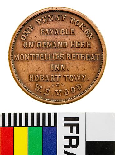 Obverse: ONE PENNY TOKEN PAYABLE ON DEMAND HERE MONTPELLIER RETREAT INN HOBART TOWN W.D. WOOD Reverse: MONTPELLIER RETREAT INN W.D. WOOD