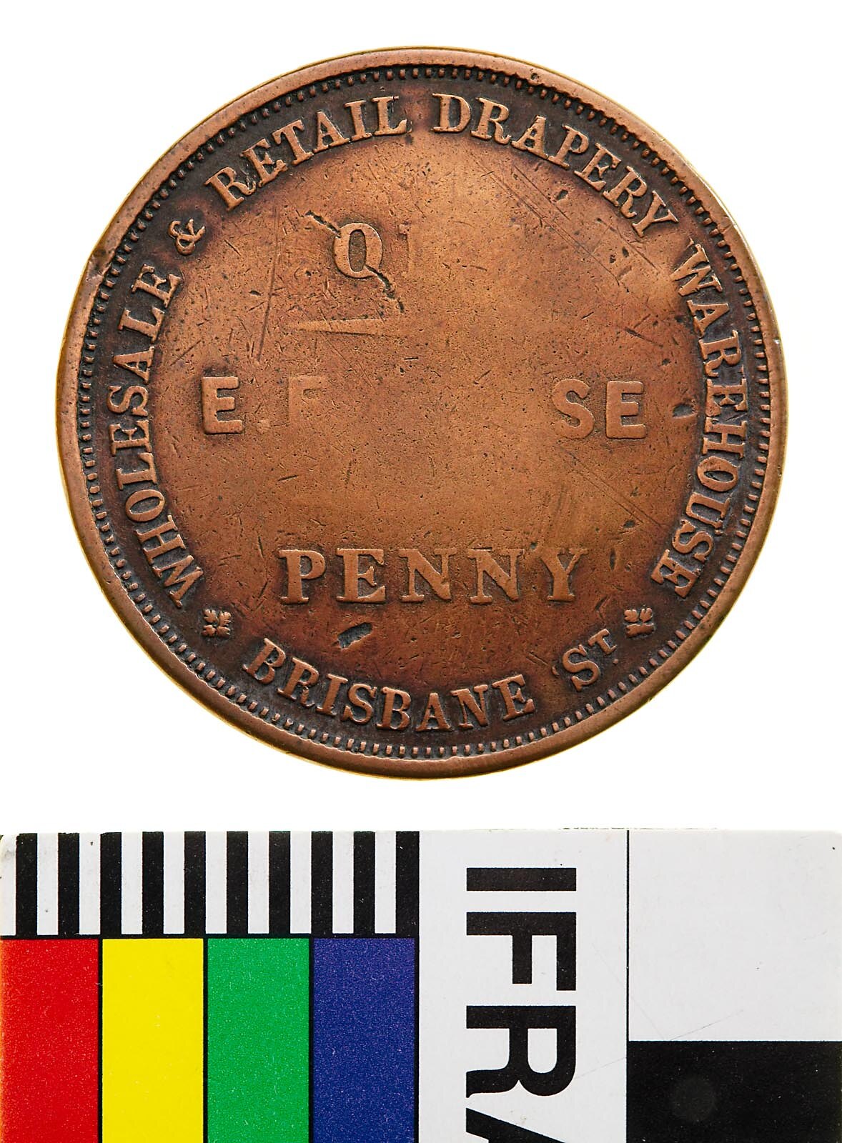 Obverse: E.F. DEASE ONE PENNY WHOLESALE & RETAIL DRAPERY WAREHOUSE BRISBANE ST. Reverse: SIC VOS NON VOBIS VELLERA FERTIS OVES