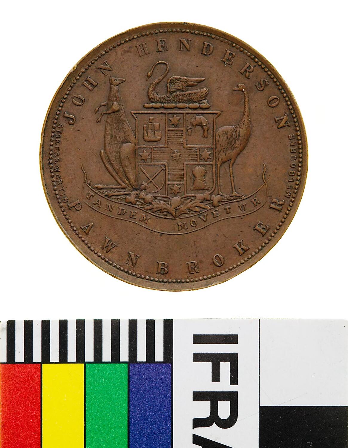 At centre a coat of arms with a swan as crest and kangaroo and emu supporters. The shield is quartered by a cross with a star at the centre and at the end of each arm, top left, three-masted sailing ship, top right, golden fleece, lower left, crossed pick and spade, lower right, wheat-sheaf. The shiels is set above a bouquet of rose, thistle and shamrock set above a ribbon with the Latin motto TANDEM MOVETUR. Around above, JOHN HENDERSON; below, PAWNBROKER; in tiny letters on either side the makers name, STOKES & MARTIN MELBOURNE