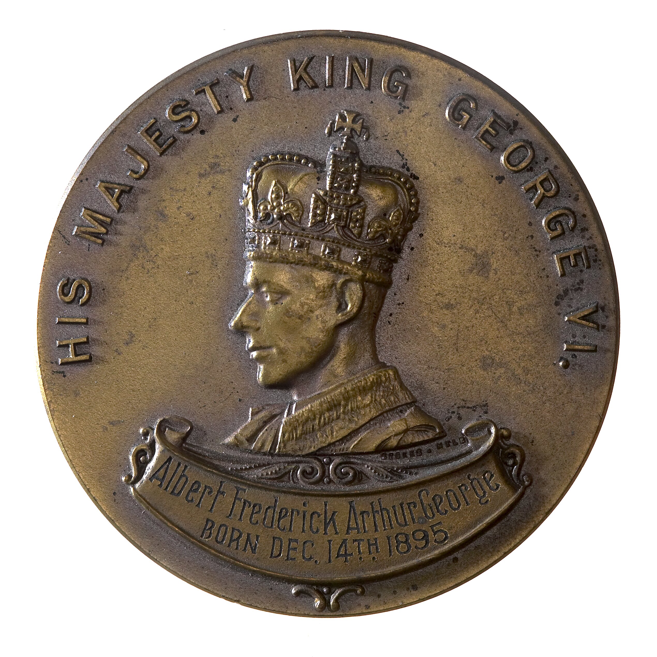 Bust of George VI crowned facing left; around above, HIS MAJESTY KING GEORGE VI.; below, scroll engraved, ALBERT FREDERICK ARTHUR GEORGE / BORN DEC. 14TH 1895 in small letters below bust, STOKES. MELB