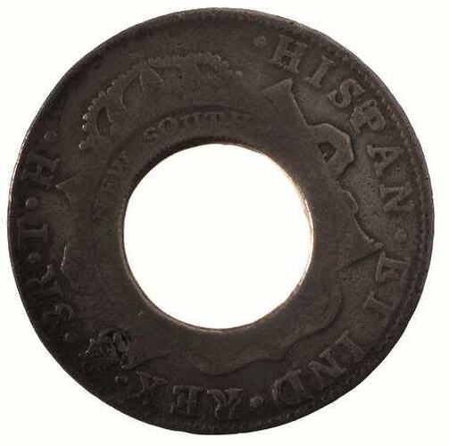 A ring shaped silver coin manufactured by cutting a circular 'dump' from the centre of a Lima mint 8 real piece of 1805 and counterstamping the words, NEW SOUTH [WALES 1813] around the central hole. Around the rim of the host coin M . 8R . T . H. HISPAN . ET IND . REX . (the first M is the mint mark and has a small letter 'o' above it); and featuring a crowned shield between pillars. Most of the shield has been removed by the holing and counterstamping. The word WALES and the date 1813 are worn off on this example.