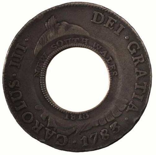 A ring shaped silver coin manufactured by cutting a circular 'dump' from the centre of a Potosi mint 8 real piece of 1783 and counterstamping the words, NEW SOUTH WALES 1813 around the central hole. Around the rim of the host coin, CAROLUS . III . DEI . GRATIA . 1783 . ; the host coin featured a laureate bust of Charles III facing right, mostly removed by the holing and counterstamping.