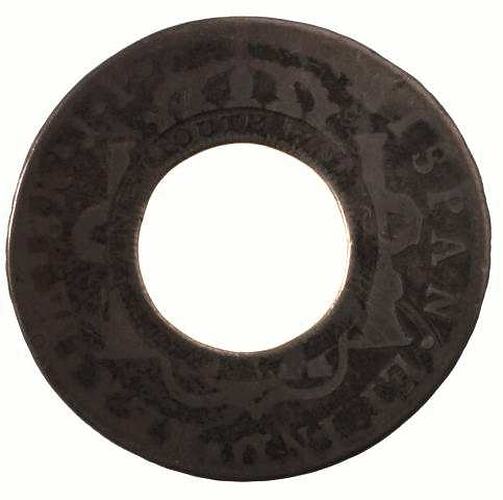 A ring shaped silver coin manufactured by cutting a circular 'dump' from the centre of a Lima mint 8 real piece of 1808 and counterstamping the words, NEW SOUTH WALES 1813 around the central hole. Around the rim of the host coin, (Lima monogram) . 8R . J . P. HISPAN . ET IND . REX . and featuring a crowned shield between pillars. Most of the shield has been removed by the holing and counterstamping.