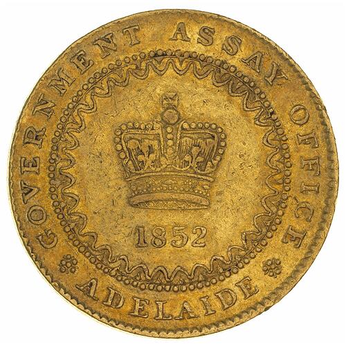 At centre a crown within ornate circle; below, 1852; around, *GOVERNMENT ASSAY OFFICE* ADELAIDE.