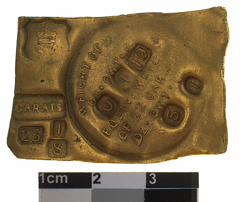 The obverse markings state that (the original) ingot was 23 1/8 carats and weighed 4 dwt 19 gr which gave it the equivalent in 22 carat gold of 5 dwt 1 gr.