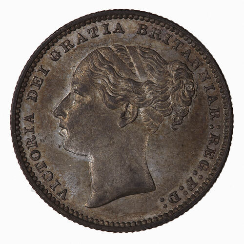Head of the Queen facing left, ribbon in hair; around, VICTORIA DEI GRATIA BRITANNIAR: REG: F:D: