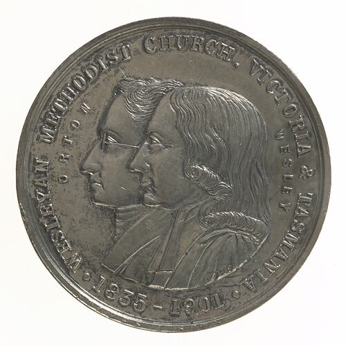 Conjoined busts of Orton and Wesley left; around, WESLEYAN METHODIST CHURCH, VICTORIA & TASMANIA. 1835 - 1901. at left, ORTON; at right, WESLEY Makers name, STOKES & SONS in tiny letters on rim below dates. Artists initials on truncation of Wesley's bust, HS