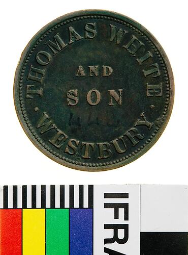 A round copper token (34 mm diameter) featuring the name and Town that issued the tokens: Thomas White and Son, Westbury. The reverse depicts a kangaroo and emu facing each other and gives the date of issue, 1857.