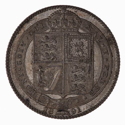 A shilling is a 12 pence coin. Struck as part of a new coinage in gold and silver to commemorate the Golden Jubilee of Queen Victoria, 1837-1887. The coins all shared a new 'Jubilee' obverse of the Queen by Boehm, adapted from his own Jubillee medal. The new obverse proved unpopular but was used until 1893. The reverse is adapted from the shilling of George IV used from 1823 to 1825.