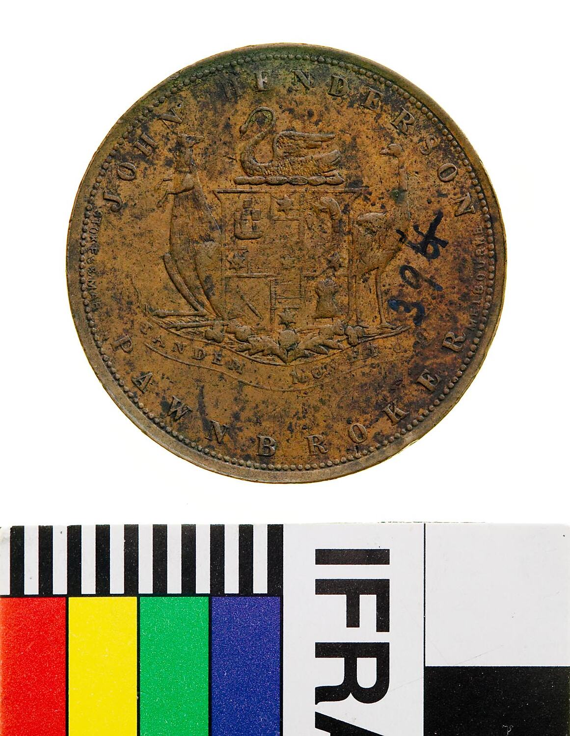 A round copper token (31 mm diameter) with the name, address and business of the issuer: John Henderson, Peckenham St. Freemantle (sic) W.A., Pawnbroker. The obverse features a coat of arms with a swan as crest and kangaroo and emu supporters. The reverse depicts a large building with a flag-staff on the roof. The manufacturers name STOKES & MARTIN MELBOURNE is in small letters on the obverse. This token has 394 inked on the obverse.
