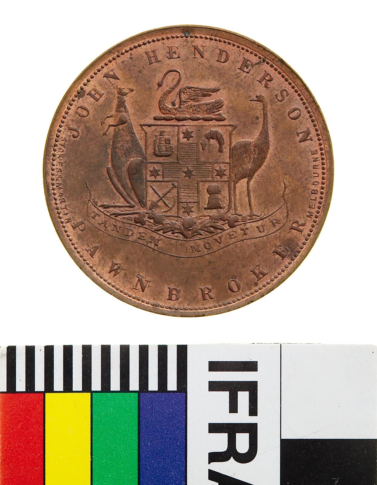 At centre a coat of arms with a swan as crest and kangaroo and emu supporters. The shield is quartered by a cross with a star at the centre and at the end of each arm, top left, three-masted sailing ship, top right, golden fleece, lower left, crossed pick and spade, lower right, wheat-sheaf. The shiels is set above a bouquet of rose, thistle and shamrock set above a ribbon with the Latin motto TANDEM MOVETUR. Around above, JOHN HENDERSON; below, PAWNBROKER; in tiny letters on either side the makers name, STOKES & MARTIN MELBOURNE