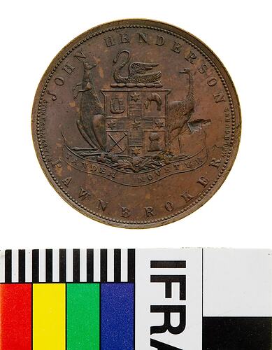 At centre a coat of arms with a swan as crest and kangaroo and emu supporters. The shield is quartered by a cross with a star at the centre and at the end of each arm, top left, three-masted sailing ship, top right, golden fleece, lower left, crossed pick and spade, lower right, wheat-sheaf. The shiels is set above a bouquet of rose, thistle and shamrock set above a ribbon with the Latin motto TANDEM MOVETUR. Around above, JOHN HENDERSON; below, PAWNBROKER; in tiny letters on either side the makers name, STOKES & MARTIN MELBOURNE