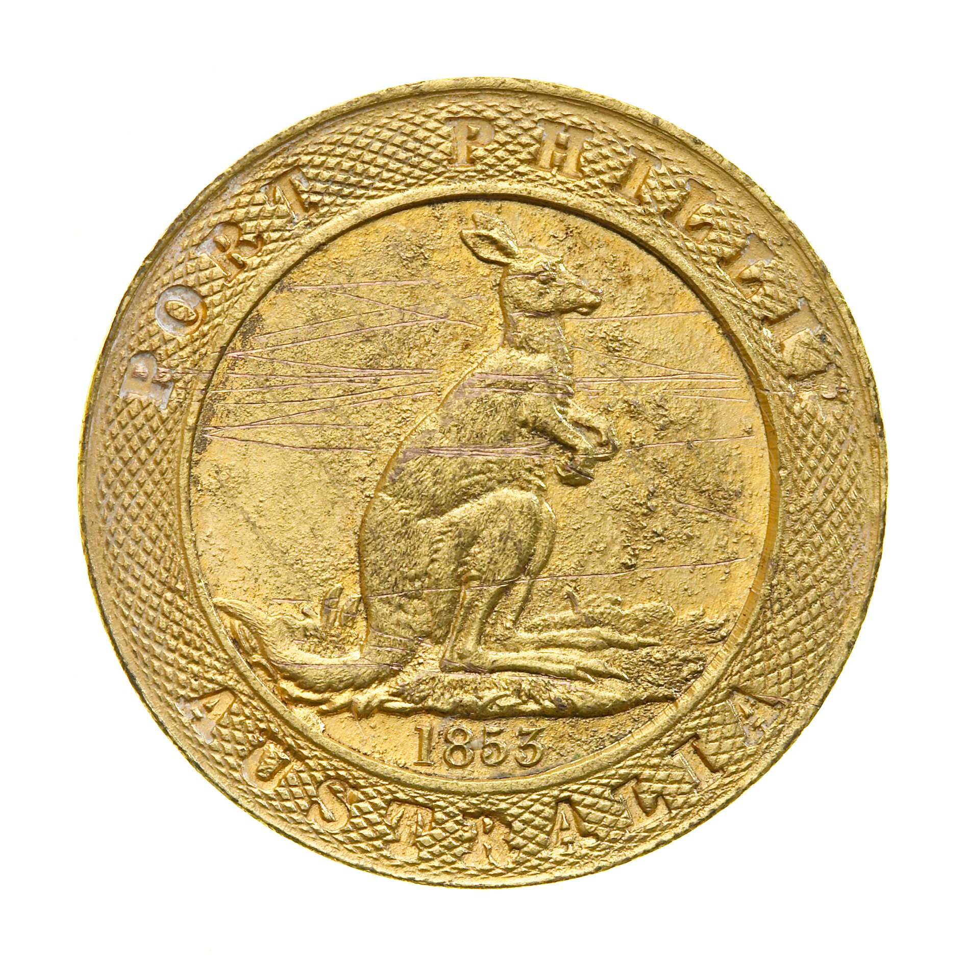 At centre within broad machined rim a kangaroo facing right, below, 1853; around, impressed into machined rim, PORT PHILLIP AUSTRALIA