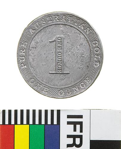At centre within broad machined rim a kangaroo facing right, below, 1853; around, impressed into machined rim, PORT PHILLIP AUSTRALIA