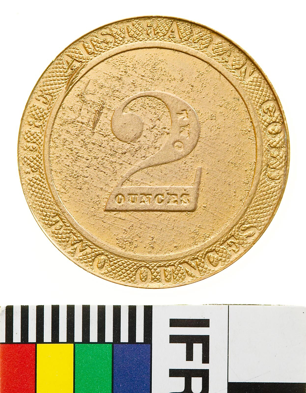 Obverse: PORT PHILLIP / 1853 / AUSTRALIA Reverse: TWO OUNCES inside number 2; around above, PURE AUSTRALIAN GOLD / TWO OUNCES