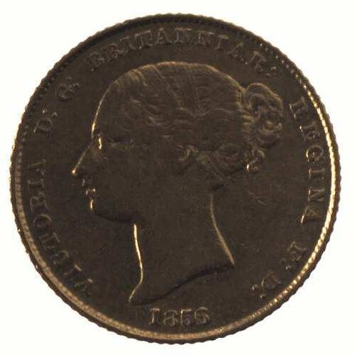 A gold coin (19 mm diameter with milled edge) featuring a head of Queen Victoria facing left with the date 1856 below. The reverse features the word AUSTRALIA below a royal crown within a wreath of laurel and with the words SYDNEY MINT above and HALF SOVEREIGN below.