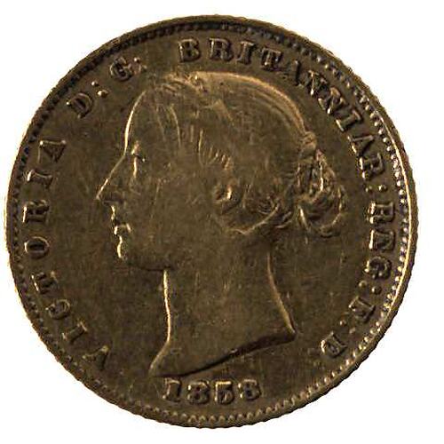 A gold coin (19 mm diameter with milled edge) featuring a head of Queen Victoria facing left and wearing a wreath of banksia with the date 1858 below. The reverse features the word AUSTRALIA below a royal crown within a wreath of laurel and with the words SYDNEY MINT above and HALF SOVEREIGN below.