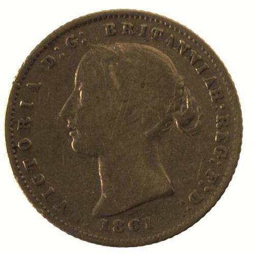 Head of Queen Victoria facing left and wearing a wreath of banksia which is plaited, the date 1861 below.; around, VICTORIA D:G: BRITANNIAR: REG: F:D: