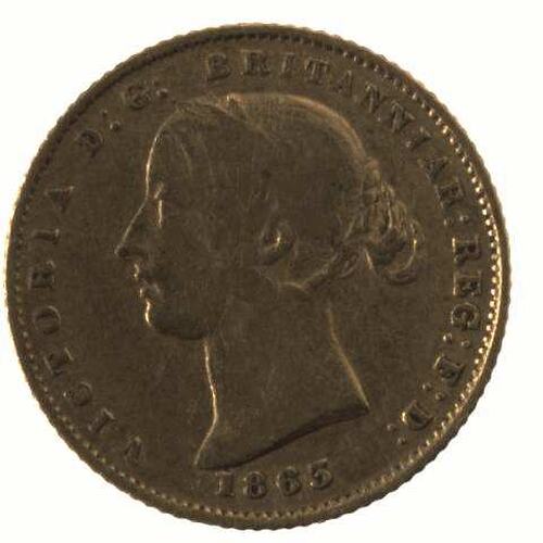A gold coin (19 mm diameter with milled edge) featuring a head of Queen Victoria facing left and wearing a wreath of banksia with the date 1863 below. The reverse features the word AUSTRALIA below a royal crown within a wreath of laurel and with the words SYDNEY MINT above and HALF SOVEREIGN below.