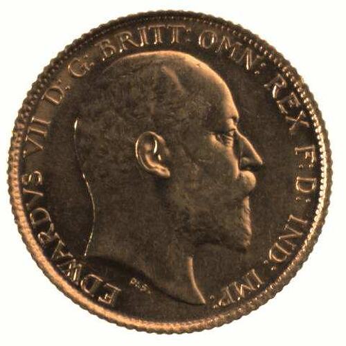 Head of King Edward VII facing right; around, EDWARDVS VII D:G: BRITT: OMN: REX F:D: IND:IMP: below the head in tiny letters the artist's initials DES.