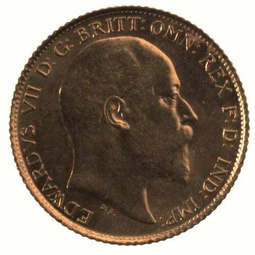 A gold coin (19 mm diameter with milled edge) featuring a bare head of King Edward VII facing right; around, EDWARDVS VII D:G: BRITT: OMN: REX F:D: IND:IMP: below the head in tiny letters the artist's initials DES. The reverse features St. George on horseback holding short sword, the horse rearing to right over a fallen dragon which has a broken lance in its chest; in exergue, the date, 1903. The mint mark S is in the ground above the middle of the date.