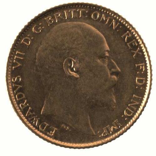 A gold coin (19 mm diameter with milled edge) featuring a bare head of King Edward VII facing right; around, EDWARDVS VII D:G: BRITT: OMN: REX F:D: IND:IMP: below the head in tiny letters the artist's initials DES. The reverse features St. George on horseback holding short sword, the horse rearing to right over a fallen dragon which has a broken lance in its chest; in exergue, the date, 1910 and the artist's initials B.P. The mint mark S is in the ground above the middle of the date.