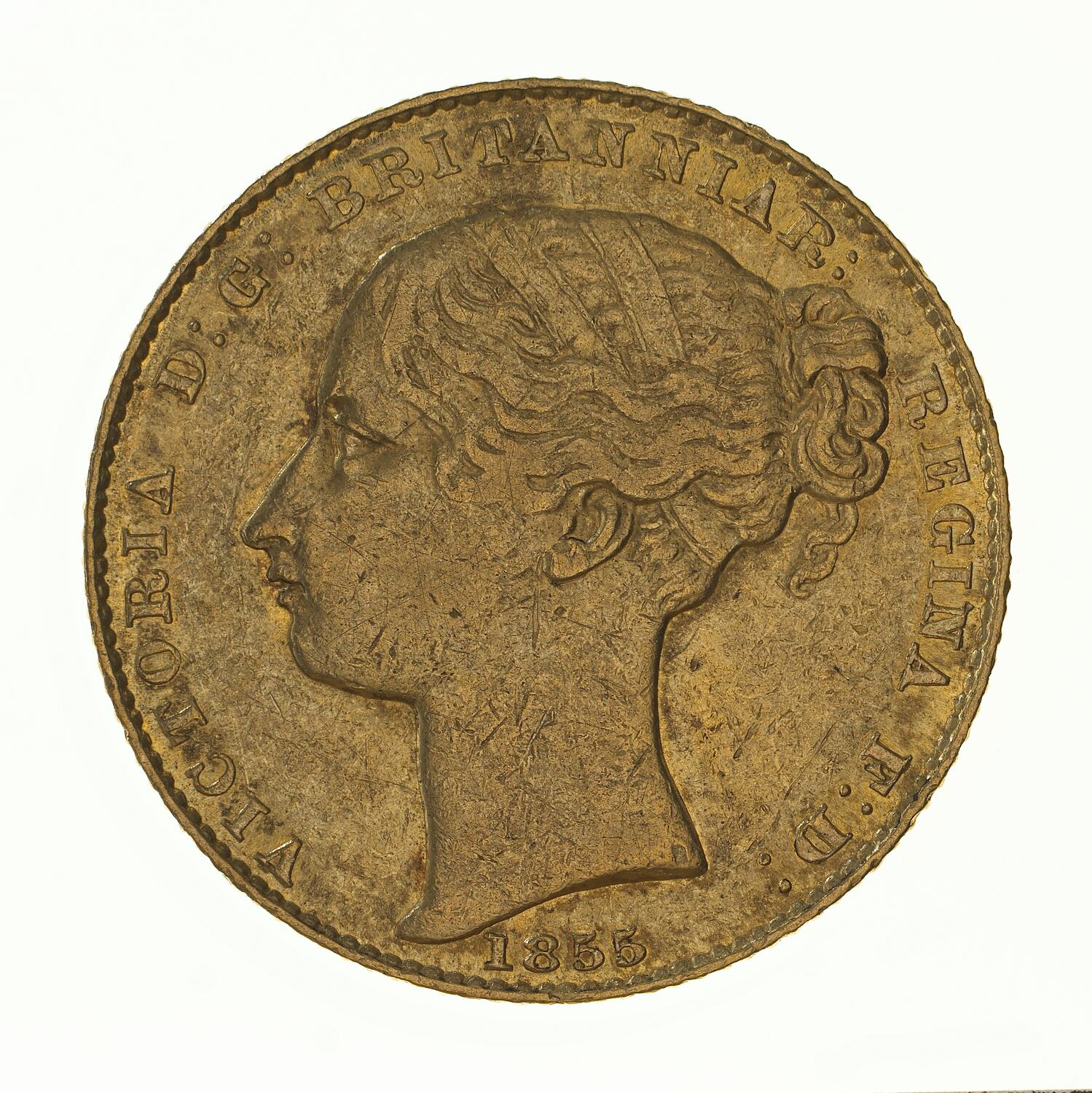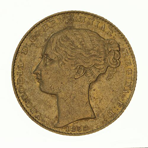 Obverse: VICTORIA D:G: BRITANNIAR: REGINA F:D: 1855 Reverse: SYDNEY MINT AUSTRALIA HALF SOVEREIGN