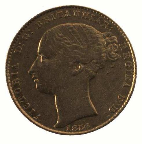 A gold coin (21.5 mm diameter with milled edge) featuring a head of Queen Victoria facing left, her hair plain and filleted; the legend, VICTORIA D:G: BRITANNIAR: REGINA F:D: around and the date, 1856 below. The reverse features the word AUSTRALIA below a royal crown within a wreath of laurel; around above, SYDNEY MINT, around below, ONE SOVEREIGN
