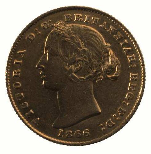 A gold coin (21.5 mm diameter with milled edge) featuring a head of Queen Victoria facing left and wearing a wreath of banksia with the date 1866 below. The reverse features the word AUSTRALIA below a royal crown within a wreath of laurel and with the words SYDNEY MINT above and ONE SOVEREIGN below.
