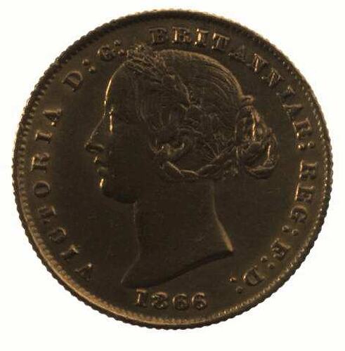 A gold coin (21.5 mm diameter with milled edge) featuring a head of Queen Victoria facing left and wearing a wreath of banksia with the date 1866 below. The reverse features the word AUSTRALIA below a royal crown within a wreath of laurel and with the words SYDNEY MINT above and ONE SOVEREIGN below.