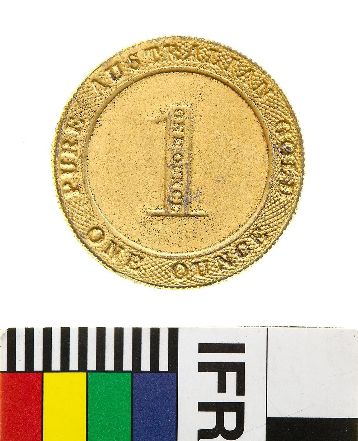 Milled (edge) At centre within circle, Kangaroo standing right, below 1853; around struck into ornate rim, PORT PHILLIP AUSTRALIA (obverse) 1 with ONE OUNCE into the number; around above, PURE AUSTRALIAN GOLD; below, ONE OUNCE (reverse)