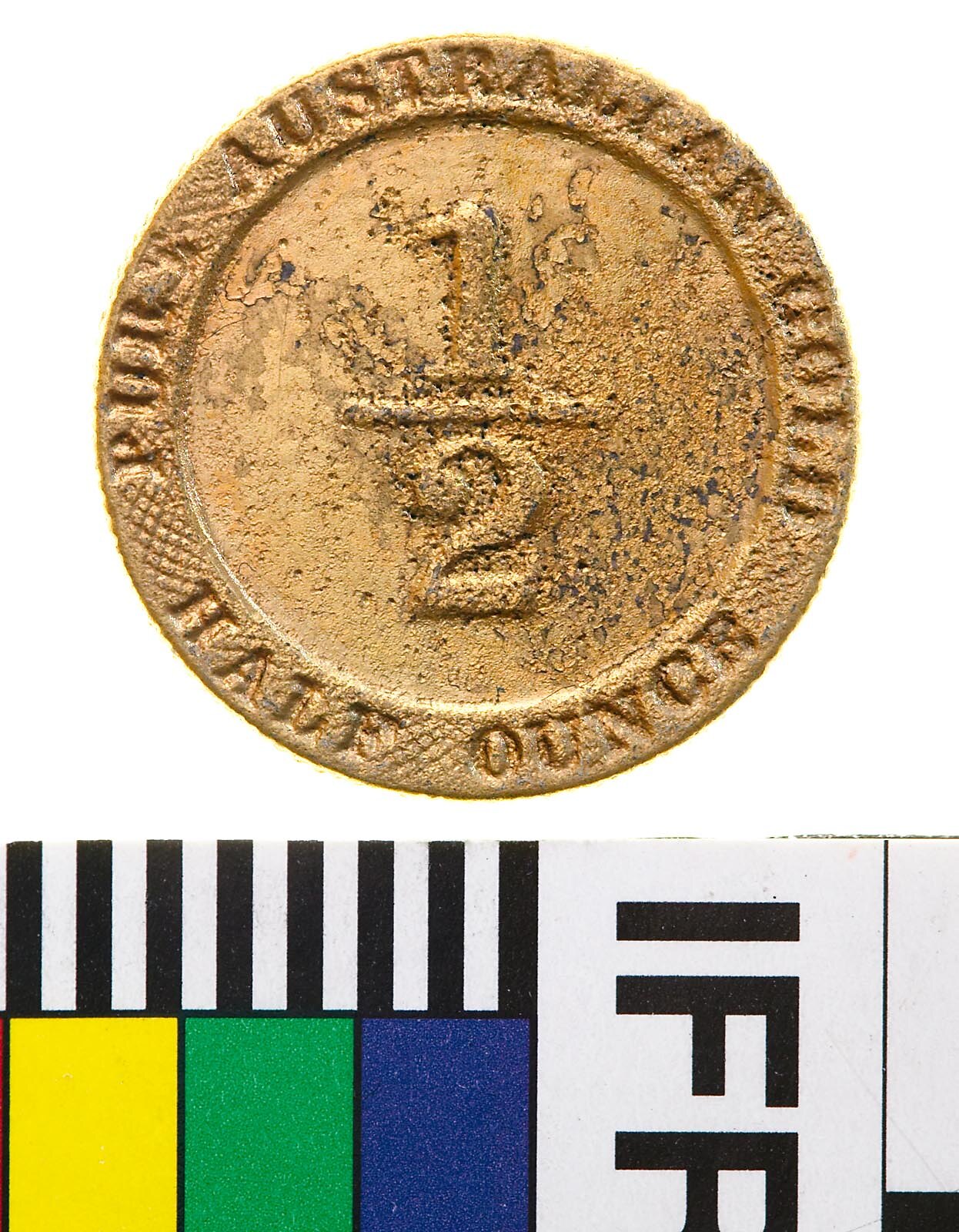 Milled (edge) At centre within circle, Kangaroo standing right, below 1853; around struck into ornate rim, PORT PHILLIP AUSTRALIA (obverse) At centre 1/2; around above, PURE AUSTRALIAN GOLD; below, ONE OUNCE (reverse)