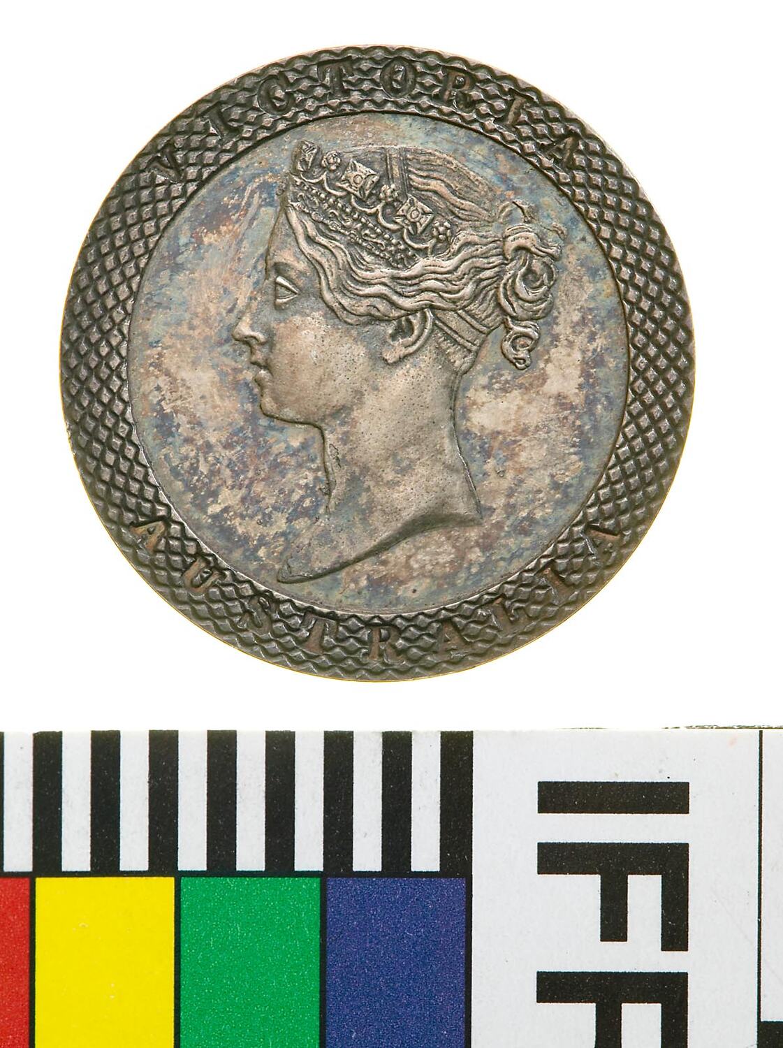 A plain edged silver strike (22 mm diameter) of a proposed shillin token. It features a crowned head of Queen Victoria facing left within a broad machine-turned rim that bears the incuse legend VICTORIA AUSTRALIA. The reverse features a large numeral 1within a broad machine-turned rim that bears the incuse legend ONE SHILLING.