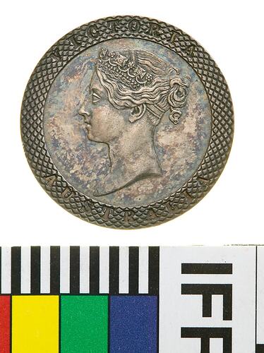 At centre a crowned head of Queen Victoria facing left within a broad machine-turned rim that bears the incuse legend VICTORIA AUSTRALIA.