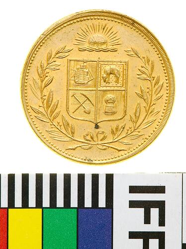 Other Details: Medal inscribed 'Port Phillip Australia' and the date 1853 on the obverse and the arms of Victoria on the reverse. The medal is dated about 1900. The die used for the obverse was cracked.