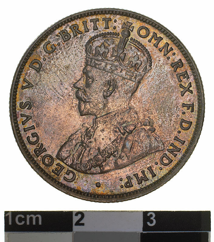 Obverse: GEORGIVS V D. G. BRITT: OMN: REX F. D. IND: IMP: Reverse: ONE FLORIN - TWO SHILLINGS 1928 ADVANCE AUSTRALIA
