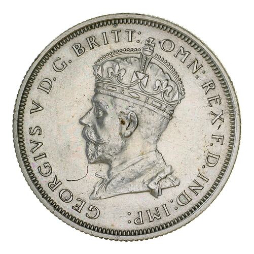Shortened version of the crowned and robed bust of George V facing left; around, GEORGIVS V D. G. BRITT: OMN: REX F. D. IND: IMP: .