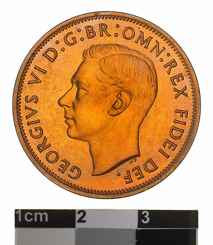 Bare head of George VI facing left; around, GEORGIVS VI D:G: BR: OMN: REX FIDEI DEF. ; below head in small lettering the artist's initials HP.