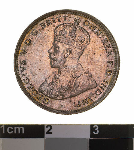 A silver coin (23.5 mm diameter with milled edge) featuring a crowned and robed bust of George V facing left; around, GEORGIVS V D.G. BRITT: OMN: REX F.D. IND: IMP: ; below bust in small lettering the artist's initials B.M. The reverse features the Ensigns Armorial of the Commonwealth of Australia, as authorised by Royal Warrent 7th May 1908 - composed of a simple shield enclosing a cross of Saint George on which are five six-pointed stars, around the outside of which are six small escutcheons, i.e., small shields. The shield is supported by a kangaroo and an emu standing on a grassy mound. Above the shield a crest, the seven-pointed star of Federation on a wreath. Below on a ribbon the motto ADVANCE AUSTRALIA. Around above, ONE SHILLING and below, between arrow heads, the date, 1925.