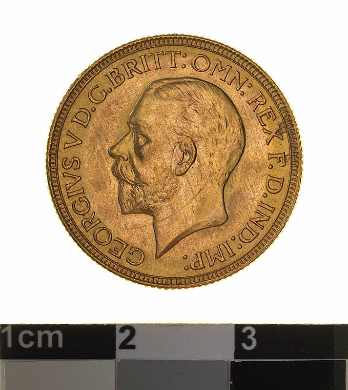 A circular gold coin (21.5 mm diameter with milled edge) featuring a bare head of George V facing left; below, the artist's initials B.M.; around, GEORGIVS V D.G. BRITT: OMN: REX F.D. IND:IMP: and on the reverse St. George on horseback holding short sword and wearing a helmet, cape and boots, the horse rearing over dragon whose side is pierced by a broken lance, the haft of the lance is on the ground behind the horse; the date, 1929 and artist's initials B.P. in exergue; the mint mark "M" in ground line above middle of date.