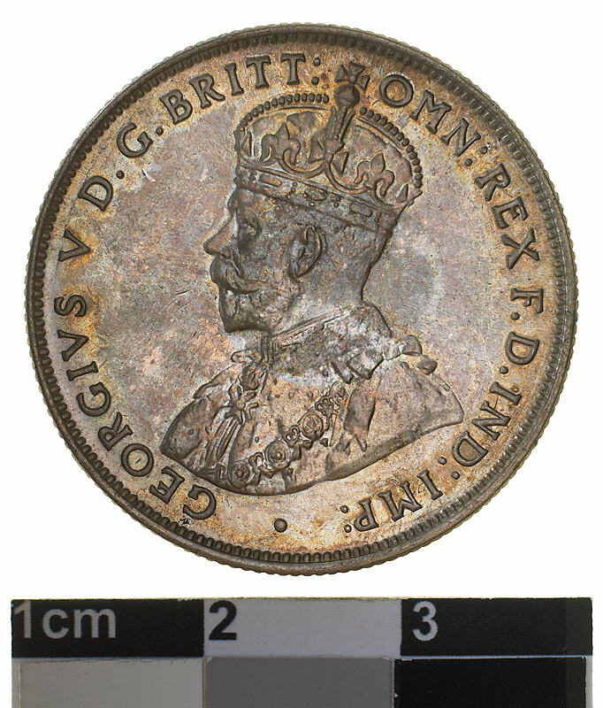 A silver coin (28 mm diameter with milled edge) featuring a crowned and robed bust of George V facing left; around, GEORGIVS V D. G. BRITT: OMN: REX F. D. IND: IMP: ; below bust in small lettering the artist's initials B.M. The reverse features the Ensigns Armorial of the Commonwealth of Australia, as authorised by Royal Warrent 7th May 1908 - composed of a simple shield enclosing a cross of Saint George on which are five six-pointed stars, around the outside of which are six small escutcheons, i.e., small shields. The shield is supported by a kangaroo and an emu standing on a grassy mound. Above the shield a crest, the seven-pointed star of Federation on a wreath. Below on a ribbon the motto ADVANCE AUSTRALIA is inscribed. Around above, ONE FLORIN - TWO SHILLINGS and below, between arrow heads, the date, 1931.