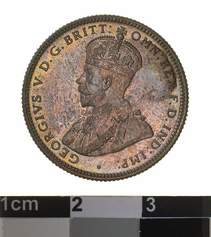 A silver coin (23.5 mm diameter with milled edge) featuring a crowned and robed bust of George V facing left; around, GEORGIVS V D.G. BRITT: OMN: REX F.D. IND: IMP: ; below bust in small lettering the artist's initials B.M. The reverse features the Ensigns Armorial of the Commonwealth of Australia, as authorised by Royal Warrent 7th May 1908 - composed of a simple shield enclosing a cross of Saint George on which are five six-pointed stars, around the outside of which are six small escutcheons, i.e., small shields. The shield is supported by a kangaroo and an emu standing on a grassy mound. Above the shield a crest, the seven-pointed star of Federation on a wreath. Below on a ribbon the motto ADVANCE AUSTRALIA is inscribed. Around above, ONE SHILLING and below, between arrow heads, the date, 1931.