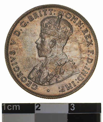 A silver coin (28 mm diameter with milled edge) featuring a crowned and robed bust of George V facing left; around, GEORGIVS V D. G. BRITT: OMN: REX F. D. IND: IMP: ; below bust in small lettering the artist's initials B.M. The reverse features the Ensigns Armorial of the Commonwealth of Australia, as authorised by Royal Warrent 7th May 1908 - composed of a simple shield enclosing a cross of Saint George on which are five six-pointed stars, around the outside of which are six small escutcheons, i.e., small shields. The shield is supported by a kangaroo and an emu standing on a grassy mound. Above the shield a crest, the seven-pointed star of Federation on a wreath. Below on a ribbon the motto ADVANCE AUSTRALIA is inscribed. Around above, ONE FLORIN - TWO SHILLINGS and below, between arrow heads, the date, 1933.