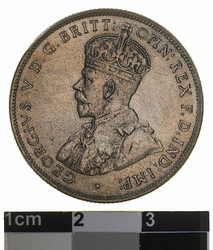 A silver coin (28 mm diameter with milled edge) featuring a crowned and robed bust of George V facing left; around, GEORGIVS V D. G. BRITT: OMN: REX F. D. IND: IMP: ; below bust in small lettering the artist's initials B.M. The reverse features the Ensigns Armorial of the Commonwealth of Australia, as authorised by Royal Warrent 7th May 1908 - composed of a simple shield enclosing a cross of Saint George on which are five six-pointed stars, around the outside of which are six small escutcheons, i.e., small shields. The shield is supported by a kangaroo and an emu standing on a grassy mound. Above the shield a crest, the seven-pointed star of Federation on a wreath. Below on a ribbon the motto ADVANCE AUSTRALIA is inscribed. Around above, ONE FLORIN - TWO SHILLINGS and below, between arrow heads, the date, 1933.