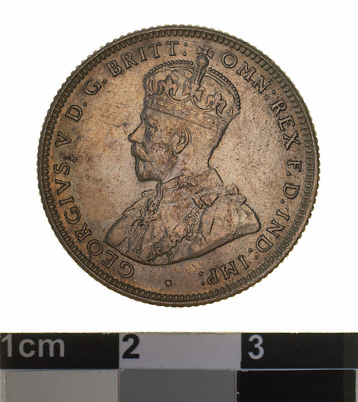 A silver coin (23.5 mm diameter with milled edge) featuring a crowned and robed bust of George V facing left; around, GEORGIVS V D.G. BRITT: OMN: REX F.D. IND: IMP: ; below bust in small lettering the artist's initials B.M. The reverse features the Ensigns Armorial of the Commonwealth of Australia, as authorised by Royal Warrent 7th May 1908 - composed of a simple shield enclosing a cross of Saint George on which are five six-pointed stars, around the outside of which are six small escutcheons, i.e., small shields. The shield is supported by a kangaroo and an emu standing on a grassy mound. Above the shield a crest, the seven-pointed star of Federation on a wreath. Below on a ribbon the motto ADVANCE AUSTRALIA is inscribed. Around above, ONE SHILLING and below, between arrow heads, the date, 1933.