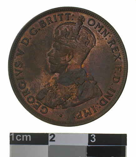 A bronze coin (30.8 mm diameter with plain edge) featuring a crowned and robed bust of George V facing left; around, GEORGIVS V D.G. BRITT: OMN: REX F.D. IND: IMP: ; below bust in small lettering the artist's initials B.M. The reverse features, within a circle of beads, the words ONE PENNY in two lines between upper and lower ornate scrolls; around the circle of beads, COMMONWEALTH OF AUSTRALIA . 1933 .