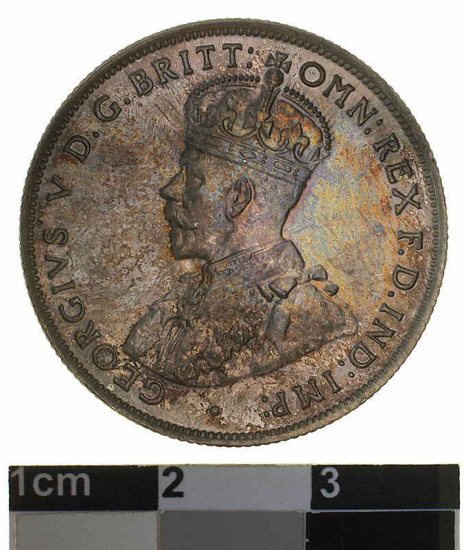 Crowned and robed bust of George V facing left; around, GEORGIVS V D. G. BRITT: OMN: REX F. D. IND: IMP: ; below bust in small lettering the artist's initials B.M.