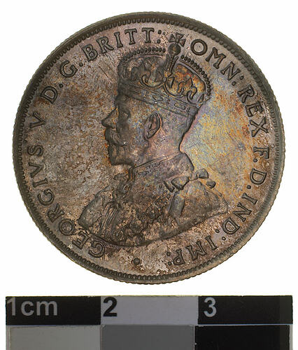 A silver coin (28 mm diameter with milled edge) featuring a crowned and robed bust of George V facing left; around, GEORGIVS V D. G. BRITT: OMN: REX F. D. IND: IMP: ; below bust in small lettering the artist's initials B.M. The reverse features the Ensigns Armorial of the Commonwealth of Australia, as authorised by Royal Warrent 7th May 1908 - composed of a simple shield enclosing a cross of Saint George on which are five six-pointed stars, around the outside of which are six small escutcheons, i.e., small shields. The shield is supported by a kangaroo and an emu standing on a grassy mound. Above the shield a crest, the seven-pointed star of Federation on a wreath. Below on a ribbon the motto ADVANCE AUSTRALIA is inscribed. Around above, ONE FLORIN - TWO SHILLINGS and below, between arrow heads, the date, 1934.