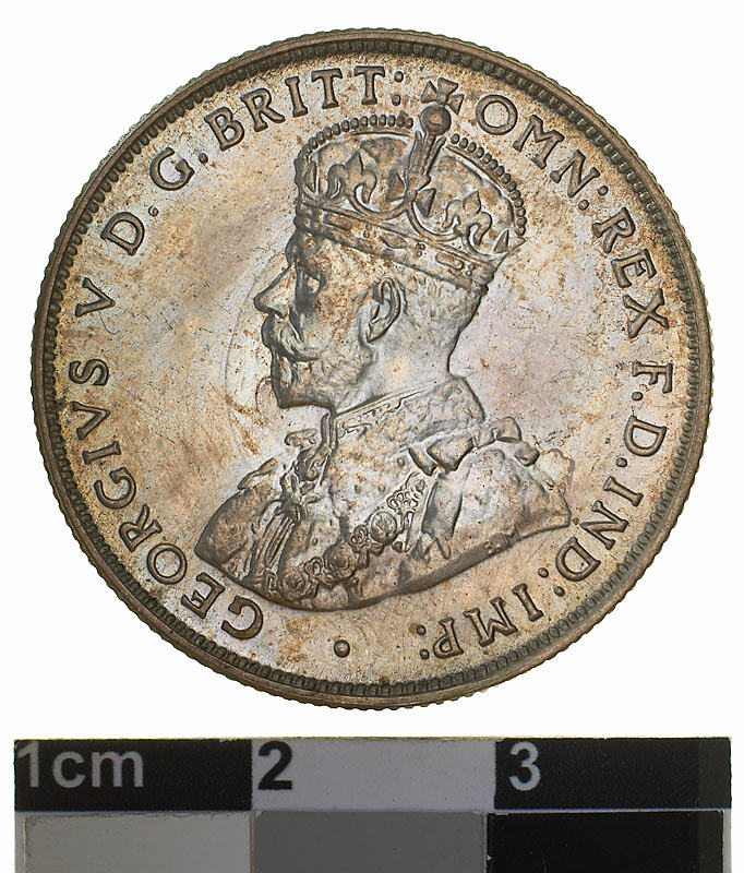 A silver coin (28 mm diameter with milled edge) featuring a crowned and robed bust of George V facing left; around, GEORGIVS V D. G. BRITT: OMN: REX F. D. IND: IMP: ; below bust in small lettering the artist's initials B.M. The reverse features the Ensigns Armorial of the Commonwealth of Australia, as authorised by Royal Warrent 7th May 1908 - composed of a simple shield enclosing a cross of Saint George on which are five six-pointed stars, around the outside of which are six small escutcheons, i.e., small shields. The shield is supported by a kangaroo and an emu standing on a grassy mound. Above the shield a crest, the seven-pointed star of Federation on a wreath. Below on a ribbon the motto ADVANCE AUSTRALIA is inscribed. Around above, ONE FLORIN - TWO SHILLINGS and below, between arrow heads, the date, 1936.